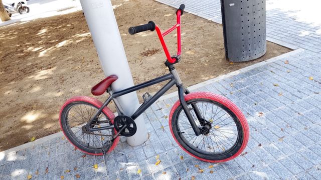 Bicicleta BMX con un diseño llamativo y ruedas de color rojo. - Cuadro de color negro. - Manillar rojo. - Ruedas de color rojo.