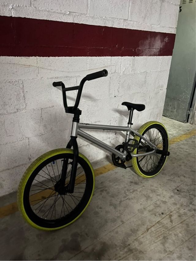 Bicicleta BMX de color plateado con detalles en negro y ruedas de color verde lima. - Cuadro de metal. - Manillar alto. - Ruedas de 20 pulgadas.
