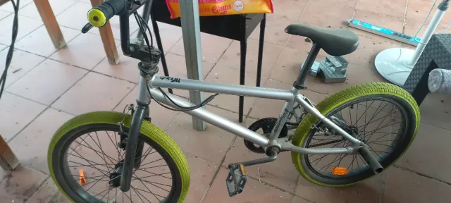 Bicicleta BMX de color plateado con ruedas de color verde lima. - Cuadro de metal. - Manillar con puños amarillos. - Pedales negros.
