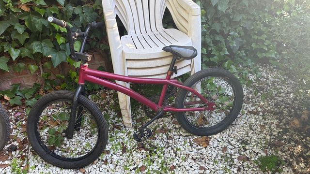 Detalles del productoBicicleta BMX de color rojo, tiene las ruedas desinfladas por el desuso pero sin pinchazos y falta uno de los dos puños del manillar