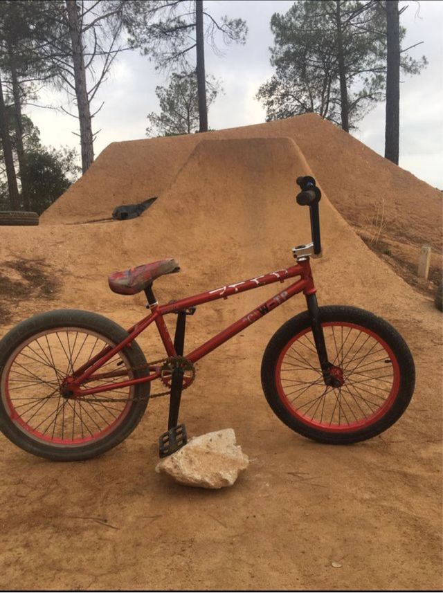 Bicicleta BMX de color rojo, lista para la acción. - Cuadro de BMX. - Ruedas de BMX.