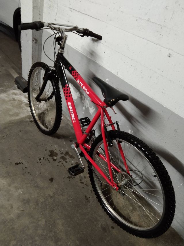 Bicicleta de montaña BTT BASIC en color rojo y negro. Ideal para iniciarse en el ciclismo. - Cuadro de metal. - Ruedas de 26 pulgadas. - Frenos. - Pedales.