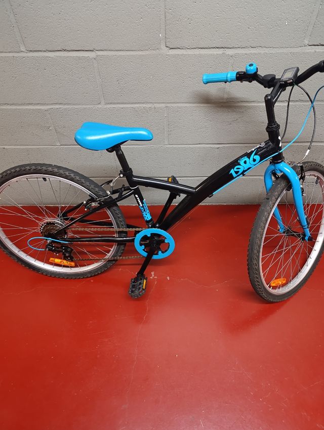 Bicicleta Btwin modelo 1986 con un diseño llamativo en negro y azul. - Cuadro de bicicleta. - Ruedas de bicicleta. - Sillín azul. - Manillar azul.