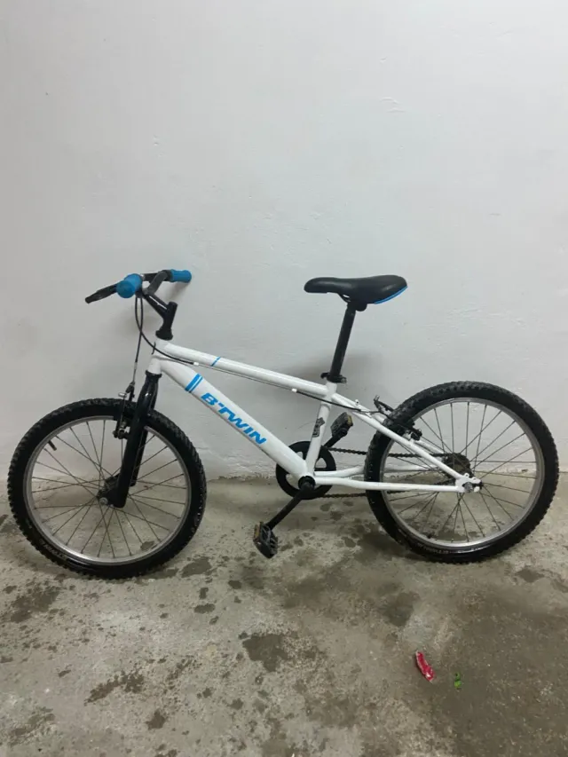 Bicicleta BTWIN con un diseño moderno en blanco y detalles en azul. - Cuadro de bicicleta. - Ruedas de bicicleta. - Sillín de bicicleta. - Manillar de bicicleta.