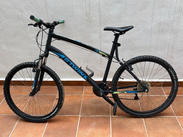 Bicicleta de montaña Btwin en color negro. - Cuadro de aluminio. - Ruedas de 27.5 pulgadas. - Frenos de disco. - Suspensión delantera.