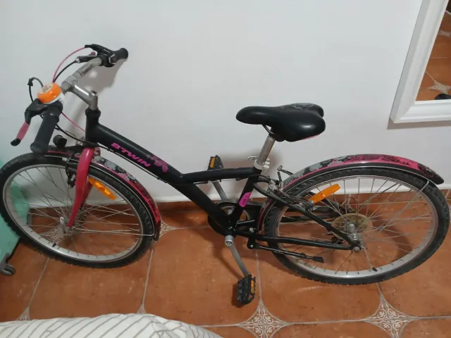 Bicicleta BTWIN en color negro con detalles en rosa y guardabarros. - Ruedas de 20 pulgadas. - Timbre naranja. - Sillín negro. - Pedales negros.