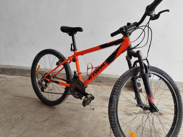Detalles del productoBicicleta de montaña BTWIN Rockrider 24, en color naranja y negro. Está en buen estado.