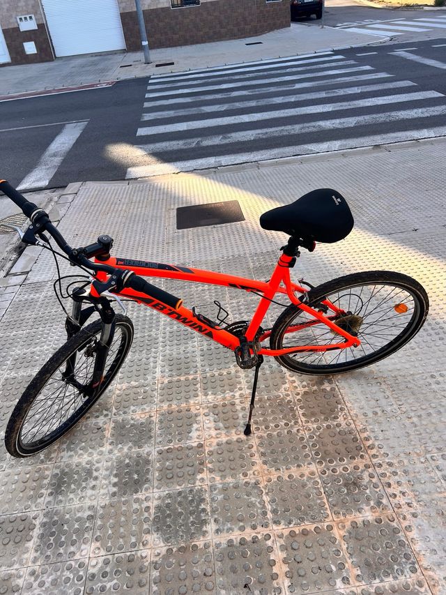 Bicicleta Btwin Rockrider en color naranja. Ideal para paseos y rutas. - Cuadro de aluminio. - Suspensión delantera. - Cambio Shimano.