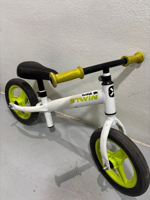 Detalles del productoBicicleta de aprendizaje Btwin en color blanco con detalles en verde lima.