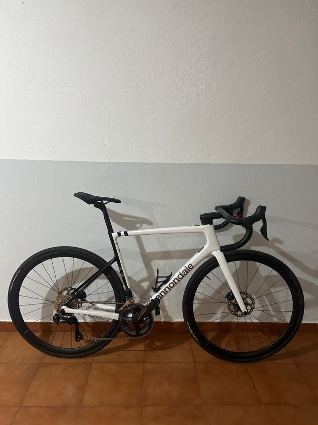Vendo bicicleta Cannondale SuperSix EVO Carbon Disc 105 Di2, color blanco, talla 54, en muy buen estado, sin golpes ni incidencias. Mantenimiento al día.