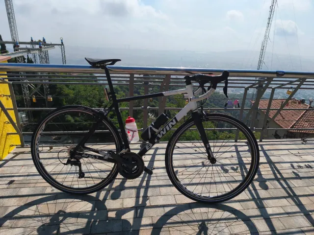 Bicicleta de carretera Triban RC520 en color blanco y negro. - Cuadro de aluminio. - Frenos de Zapata - Transmisión Shimano. - Ruedas de 700c.