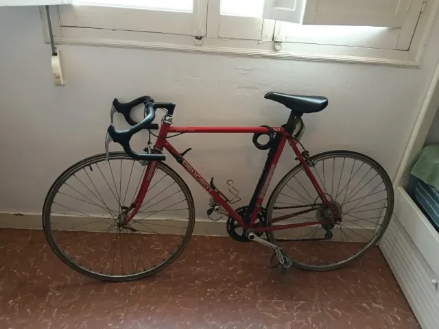 Bicicleta de carretera Peugeot de estilo vintage. - Cuadro de color rojo. - Manillar de carretera. - Sillín negro.