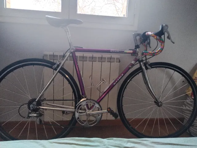 Bicicleta de carretera clásica de la marca Vitus. - Cuadro de color morado. - Manillar con cinta multicolor. - Portabidón incluido.