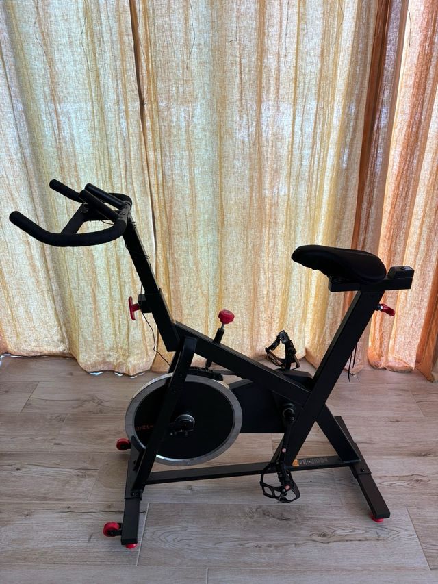Detalles del productoBicicleta de ciclo indoor Domyos Biking 100 con volante de inercia de 12kg. Diseñada para entrenamientos cardiovasculares en casa.