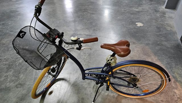 Bicicleta para mujer, prácticamente nueva. - Modelo clásico con canasta. - Color azul marino con detalles marrones. - Llantas color beige.