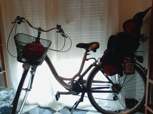 Bicicleta urbana con cesta delantera y sillín para niño. - Cesta de rejilla negra. - Sillín infantil negro.