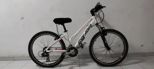 Bicicleta marca Conor para niña, con ruedas de 24 pulgadas. - Cuadro blanco con detalles en rosa. - Sillín negro.
