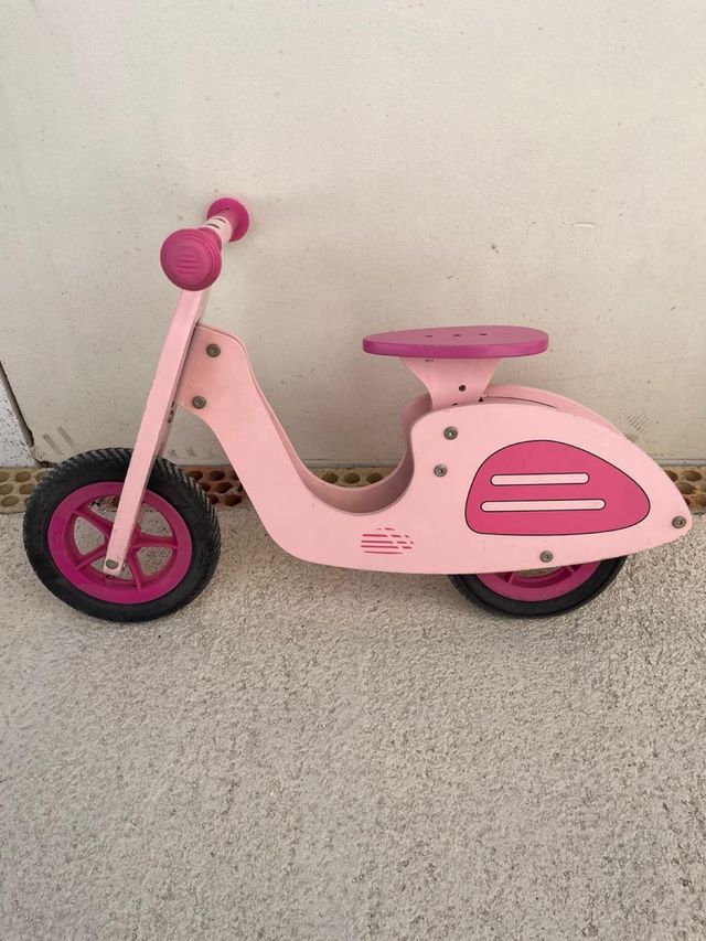 Detalles del productoBicicleta de madera con diseño de moto para los más pequeños. Es de color rosa y tiene un asiento.