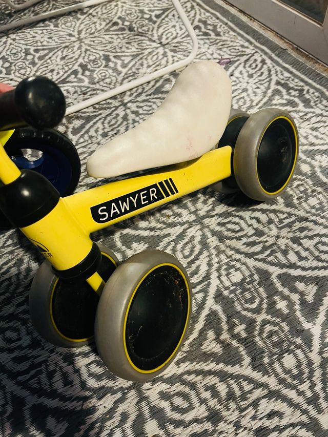 Bicicleta de aprendizaje de color amarillo con el nombre SAWYER en el lateral. - Asiento blanco. - Ruedas grises con borde amarillo. - Manillar negro.