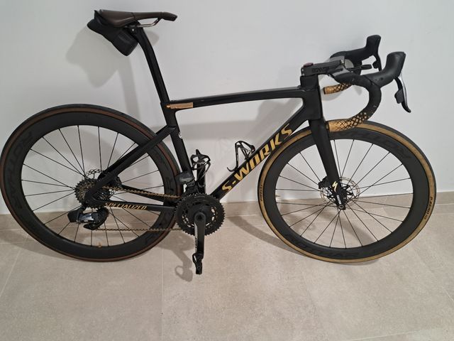 Detalles del productoBicicleta de carretera Specialized en color negro con detalles dorados. Diseño aerodinámico y componentes de alta gama.