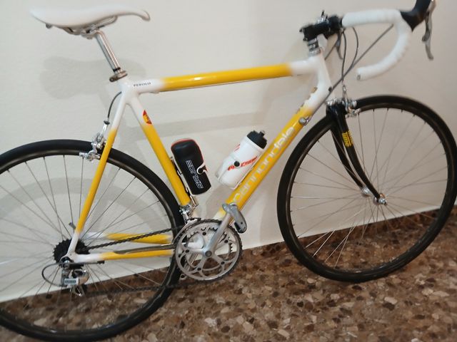 Detalles del productoBicicleta de carretera Cannondale con un llamativo diseño en blanco y amarillo. Ideal para disfrutar del ciclismo.