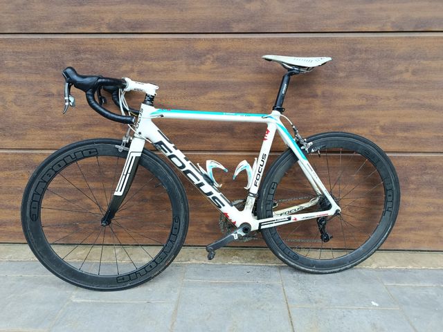 Bicicleta de carretera Focus en color blanco con detalles en azul. - Talla 54 (M) - Cuadro de carbono. - Ruedas de perfil. - Cadena y desviador nuevos.