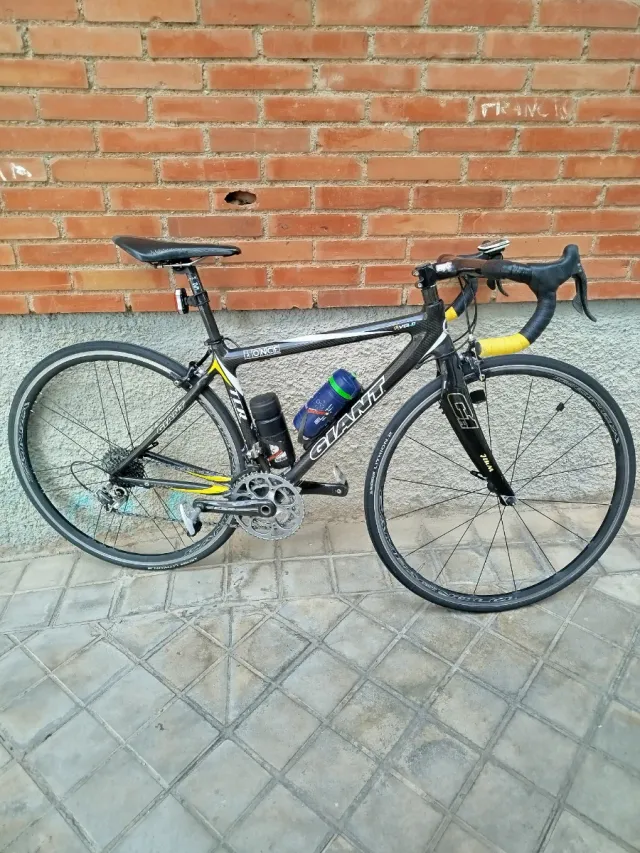 Bicicleta de carretera de la marca Giant, modelo T-Mobile. - Cuadro de carbono. - Ruedas Mavic. - Manillar con cinta amarilla.
