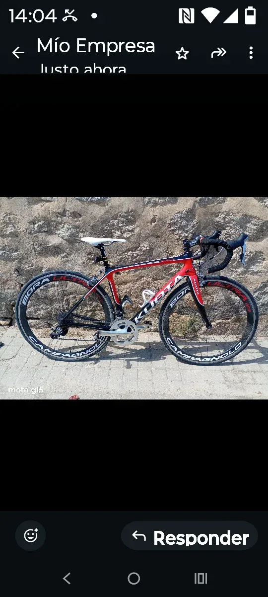 Detalles del productoBicicleta de carretera Kuota de color rojo y negro. Cuenta con ruedas Campagnolo Bora.