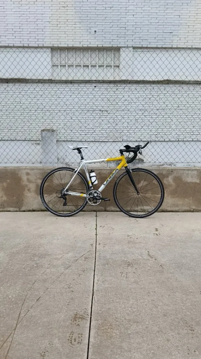 Detalles del productoBicicleta de carretera Orbea con cuadro blanco y detalles amarillos.