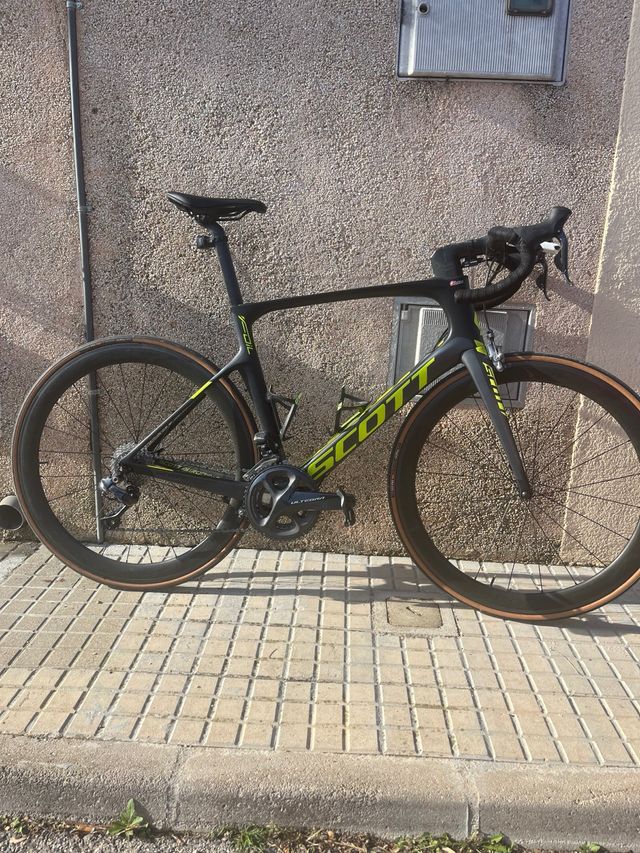 Bicicleta de carretera Scott de carbono. - Cuadro y horquilla de carbono. - Frenos Shimano Ultegra. - Ruedas de perfil. - Color negro y verde lima.