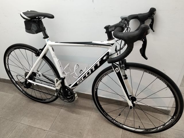 Detalles del productoBicicleta de carretera Scott de color blanco y negro.