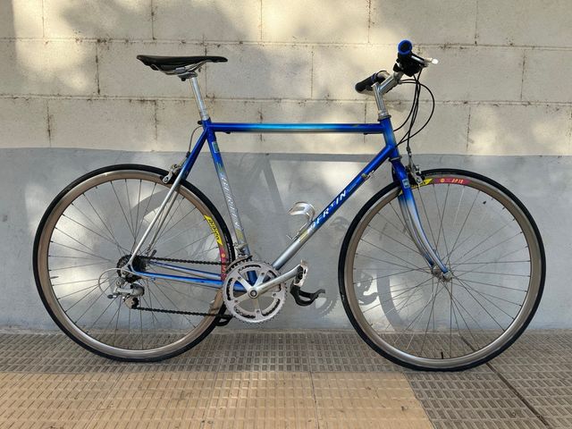 Bicicleta de ciudad con un diseño llamativo en azul y plateado. Ideal para desplazamientos urbanos. tallas L o 56 aunque es compacta grupo shimano 105