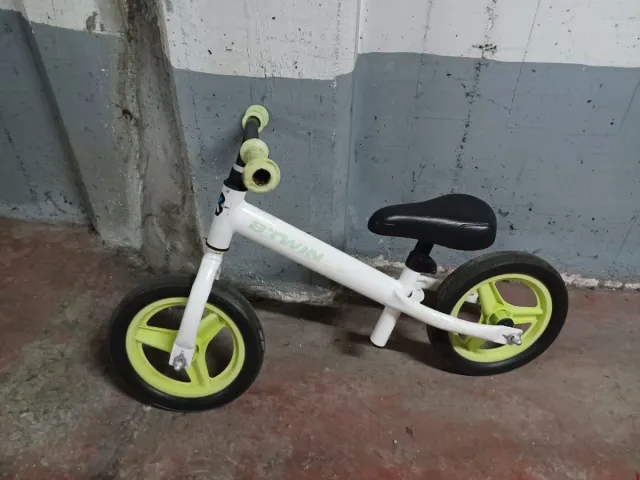Bicicleta de equilibrio Btwin en color blanco, ideal para los más pequeños. - Ruedas de color amarillo. - Puños de color verde. - Sillín negro.