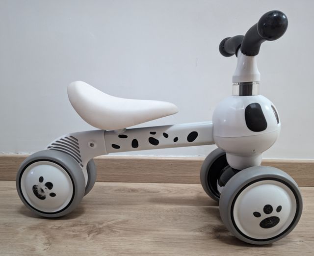 Detalles del productoBicicleta de equilibrio para bebés con 3 ruedas, asiento acolchado, manillar de goma y diseño de dálmata. Ideal para fomentar el aprendizaje del equilibrio y la propiocepción en bebés desde 1 año.