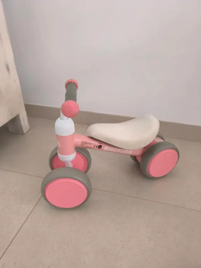 Bicicleta de aprendizaje sin pedales, ideal para los más pequeños. - Color rosa y gris. - Diseño de 4 ruedas para mayor estabilidad. - Asiento acolchado.
