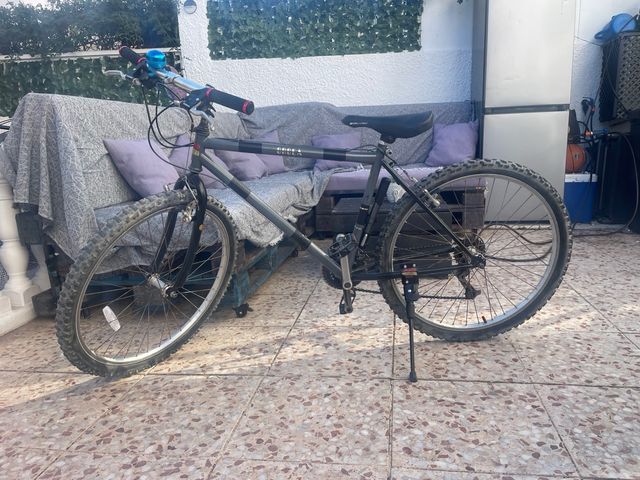 Bicicleta de montaña en color gris. - Cuadro de metal. - Ruedas todoterreno. - Manillar con puños negros y rojos. - Timbre azul.