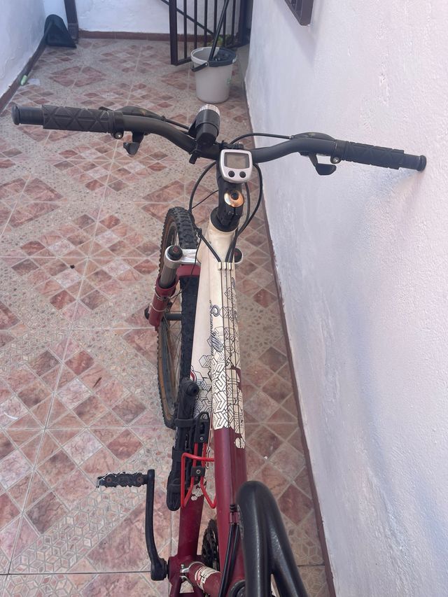 Bicicleta de montaña con un diseño llamativo en el cuadro. - Cuadro de color blanco y granate. - Ruedas todoterreno. - Manillar con puños negros. - Portabidón rojo.
