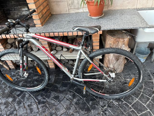 Bicicleta de montaña con un diseño moderno y detalles en rojo. - Cuadro de aluminio plateado. - Ruedas todoterreno. - Frenos de disco.