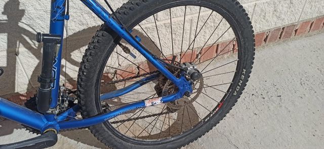 Bicicleta de montaña con cuadro azul. - Rueda delantera Kenda. - Frenos de disco. - Cadena. - Pedales.