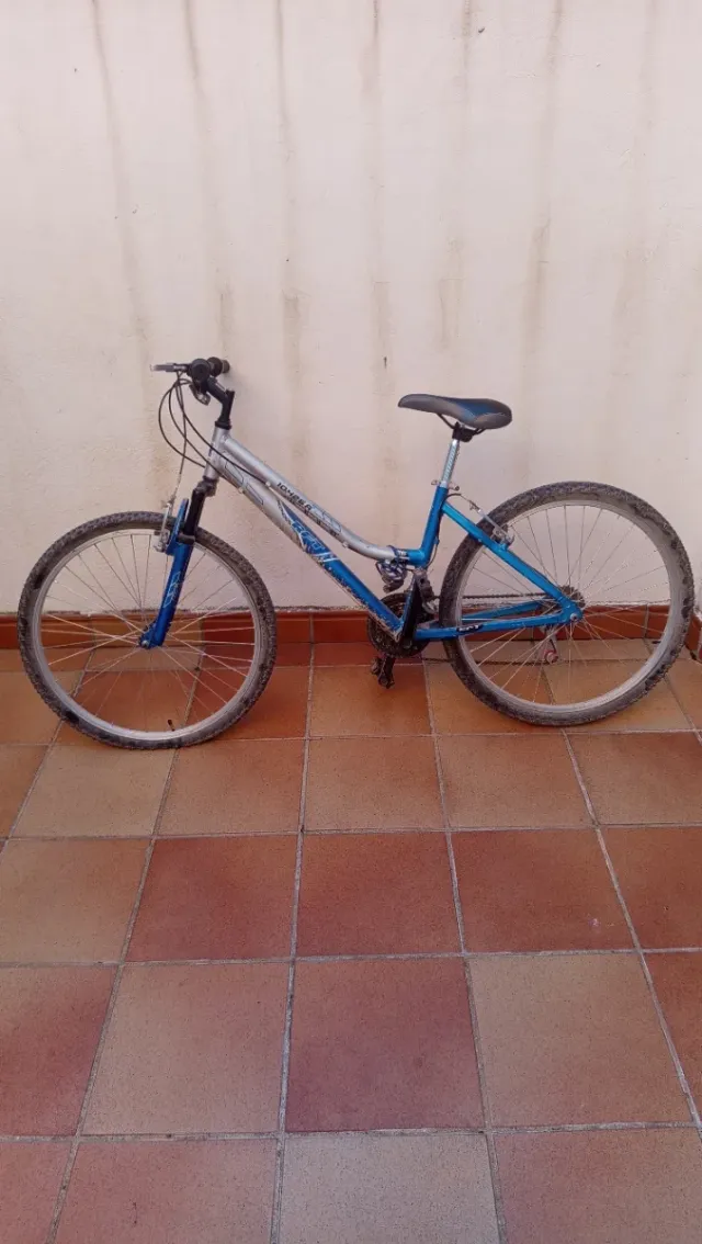 Bicicleta de montaña bastante usada pero que nunca me ha fallado. Tiene la cámara delantera pinchada y no me quedan recambios.