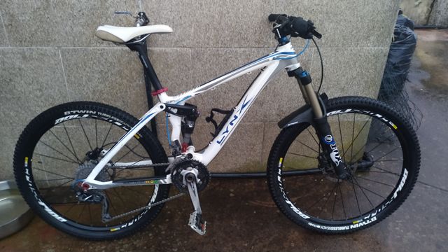 Bicicleta de montaña con doble suspensión Fox, talla s, con típicas marcas de uso en montaña.