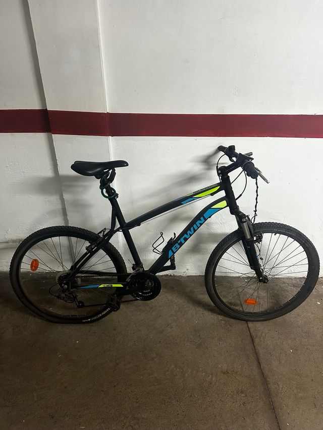 Detalles del productoBicicleta de montaña BTWIN en color negro con detalles en azul y verde.