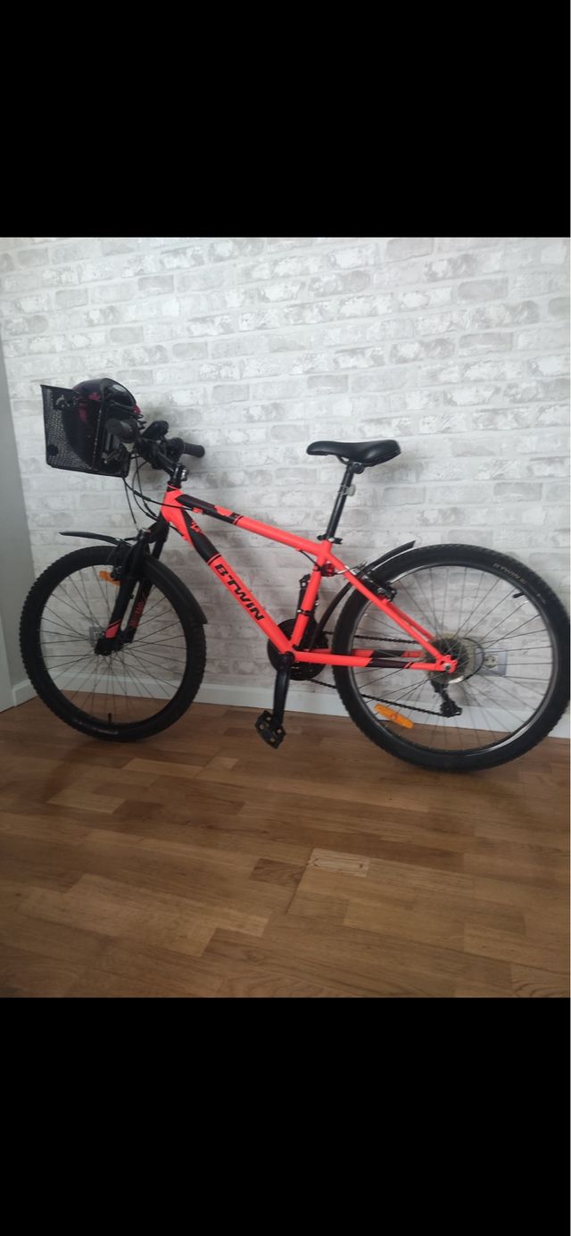 Detalles del productoBicicleta de montaña Btwin en color naranja con detalles en negro. Cuenta con suspensión delantera y guardabarros.