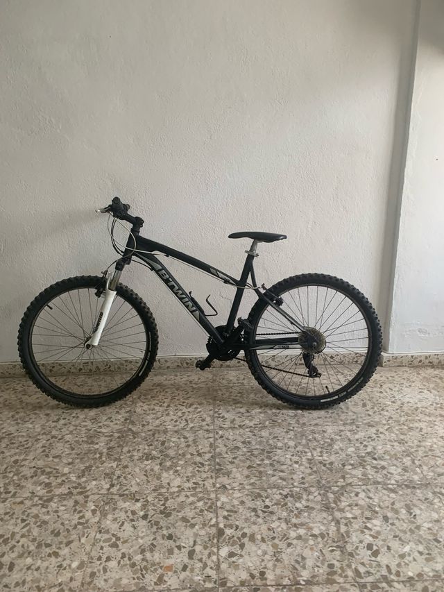 Bicicleta de montaña BTWIN en color negro. Ideal para disfrutar de rutas y caminos. - Cuadro de aluminio. - Suspensión delantera. - Cambio Shimano.