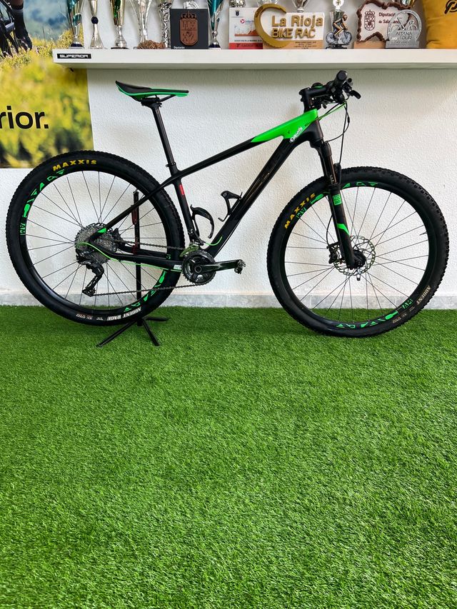 Bicicleta de carbono montada con grupo shimano deore Xt, suspensión Rock shox, pedales KCNC, ruedas de 29 con neumaticos maxxis ardent.