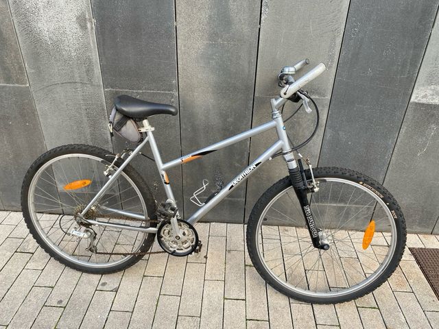 Detalles del productoBicicleta de montaña plateada, ideal para paseos y rutas.
