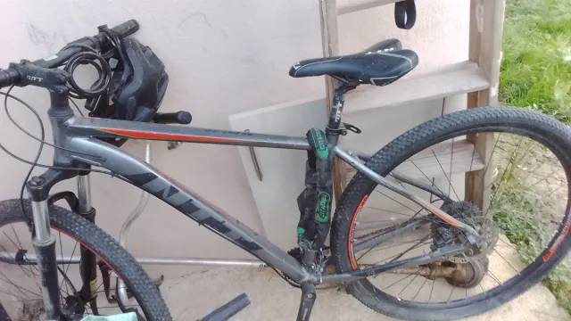Detalles del productoBicicleta de montaña en color gris con detalles en naranja.