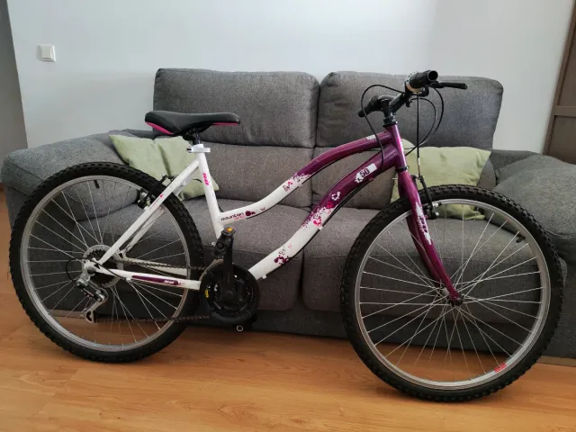 Detalles del productoBicicleta de montaña con un diseño llamativo en morado y blanco.