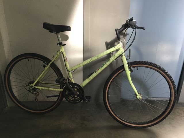 Bicicleta de montaña con un diseño llamativo. - Cuadro de color verde claro con salpicaduras. - Ruedas de 26 pulgadas. - Frenos de mano. - Cambio Shimano SIS.