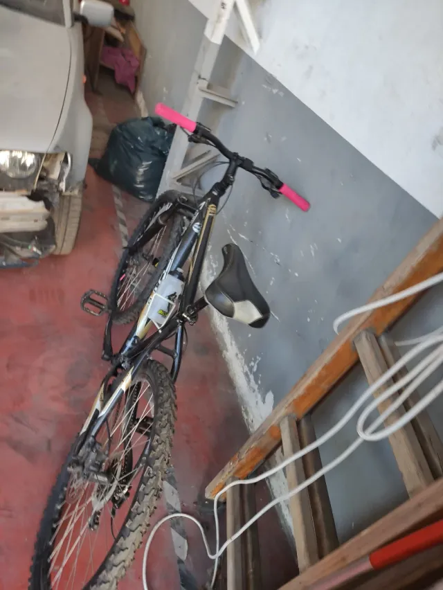 Bicicleta de montaña en color negro con detalles dorados y puños rosas. - Cuadro de aluminio. - Ruedas de 26 pulgadas. - Frenos de disco. 722591613